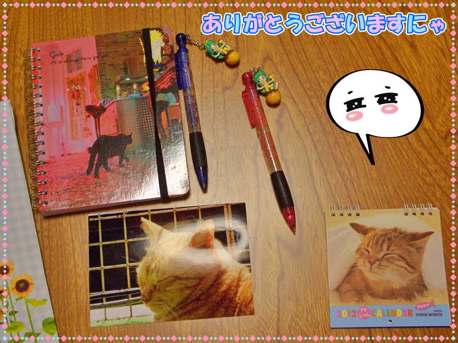 他所様の猫ちゃん あかちん様、ありがとうございます! 2011年12月13日 2023年9月1日 ウラジーミル・アスポン Facebook postはてブLINEPocketFeedly あかちん様、2011年プレゼント企画のおまけ当選のプレゼントが 届きました!おしゃれな猫のリングノートや可愛い子猫のミニカレンダー、 御当地限定のタコ焼きに乗ったラムちゃんのボールペン、シャープペンのセットを 下さり、どうもありがとうございました。 プーさんの写真も付いてて嬉しいです。送る時の封筒も猫柄で、いいですね。 本当に、ありがとうございました。 送る時の封筒も猫柄 Facebook postはてブLINEPocketFeedly
