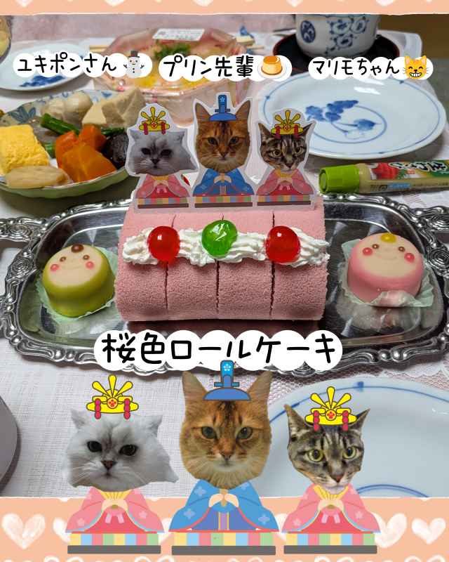 ユキポンさん⛄とマリモちゃん🐱という…ふたりのお雛様が並ぶ、なんとも華やかなひな祭りの場面🎎✨