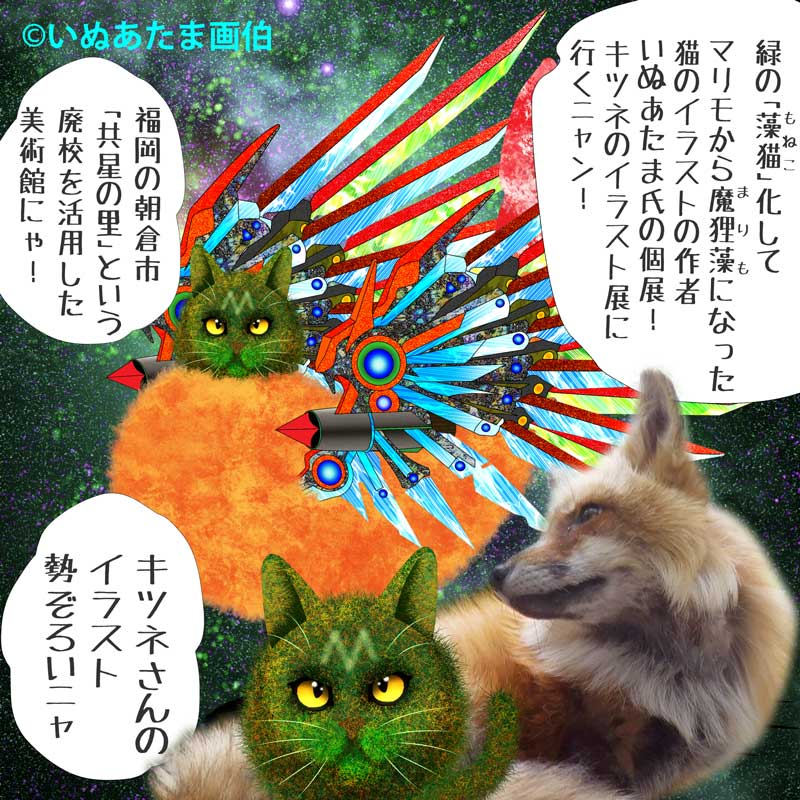 いぬあたま氏は、キツネ専門に描いていて、キツネさんがめいっぱいあるイラスト展にゃん。